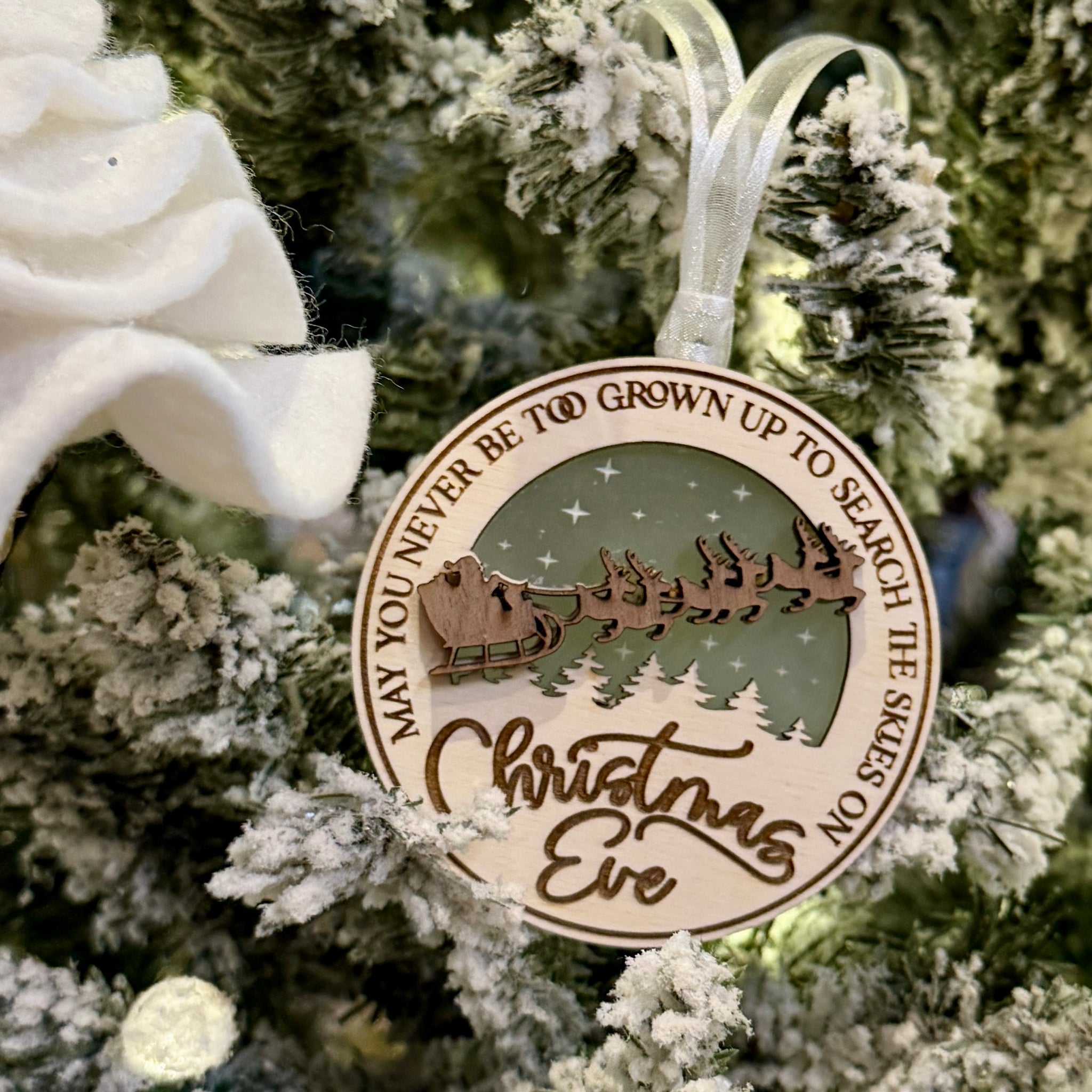 Celebrate the magic of Christmas with our Christmas Eve Ornament. This beautifully laser engraved and cut ornament features the saying "never too old to search the skies", reminding us to always keep the magic of the season alive. Hang it on your tree and cherish the memories for years to come.