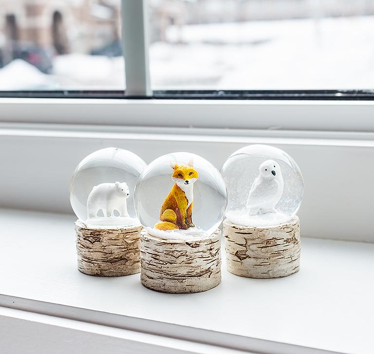 These mini snow globes are the perfect holiday accent piece for small spaces. Featuring a finely rendered fox, snowy owl and polar bear, use them alone or in a group to add a wintry touch of nature to your decor.