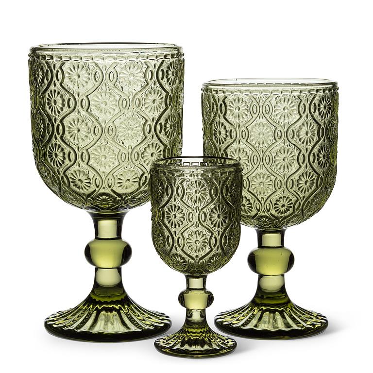 Sip in style with this elegant Daisy Wine Goblet – where vintage flair meets everyday functionality. Featuring a delicate embossed floral motif in a rich olive hue, this glass brings a burst of beauty to any table setting. This goblet adds instant elegance and a splash of personality.