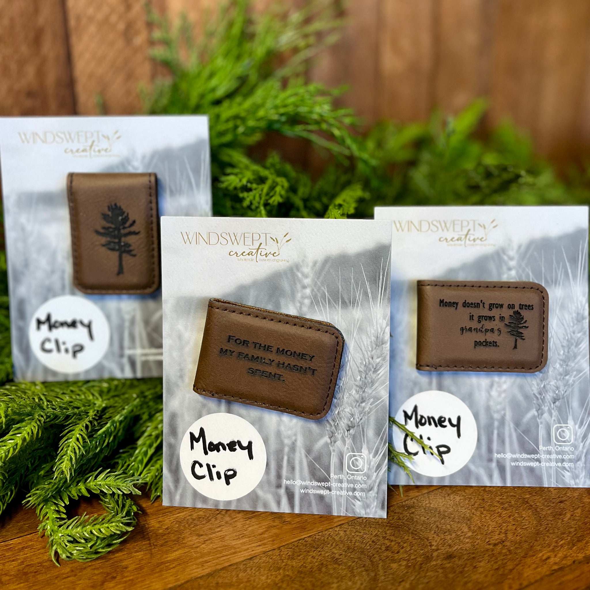 Meet your new wallet's cooler cousin! This laser-engraved leatherette money clip keeps your cash organized in style, with three eye-catching design options to pick from.