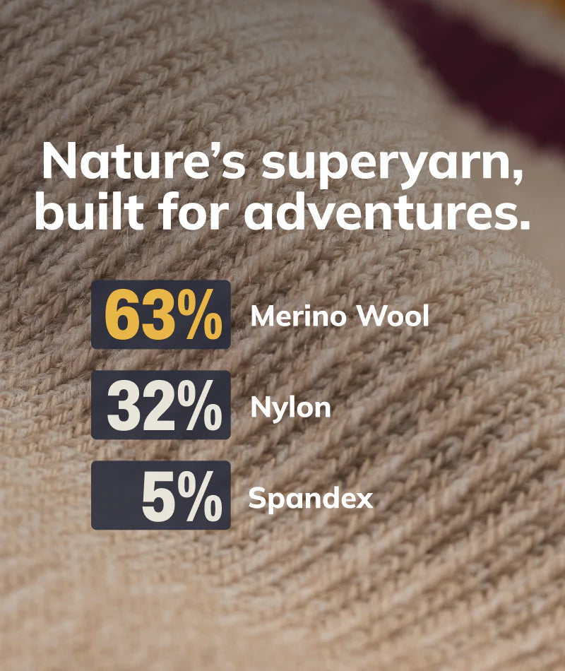 63% Wool/ 32% Nylon/ 5% Spandex. Machine wash cold, hang dry, do not tumble dry, do not bleach, do not iron, water temperate 30°C. For best results, wash socks inside out. Designed in Canada. Imported.